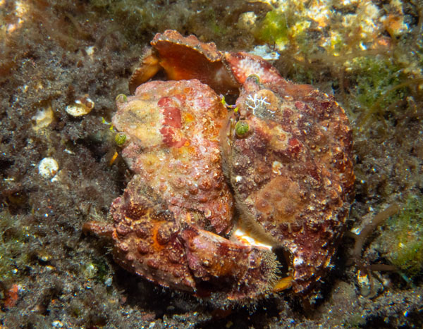 We found these in the Tulamben area and at Padangbai. I'm not sure how to reliably distinguish different species of these lumpy Calappa species, but this one seems most like web figures of C. torulosa.