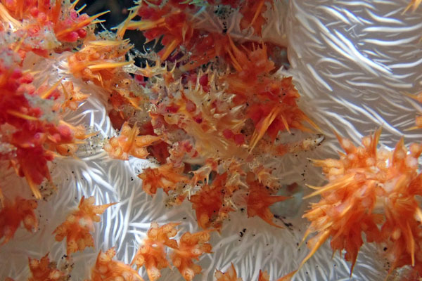 These little crabs were well camouflaged on their host, the soft coral Dendronephthya.