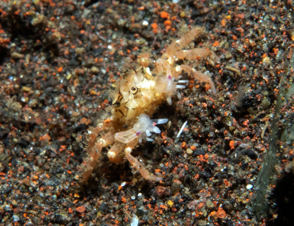 These small anemone bearing crabs were found in rubbly slopes near Tulamben.