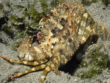 The rear pair of legs of dromiid crabs is situated so that they can be used to hold something over the crab's shell, often a sponge but sometimes tunicates, clumps of soft coral, algae or any other item that may help to shield the crab from predators. Because there are numerous species in the family and details of the crab are difficult to observe, most of our identifications are tentative.