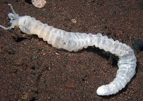 This is one of the long, flaccid sea cucumbers. Specimens below were photographed at Padangai, Seraya and Sidem.