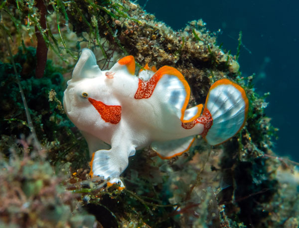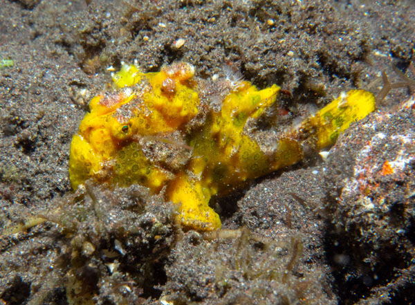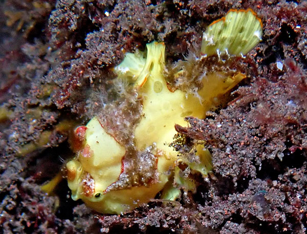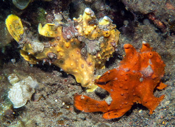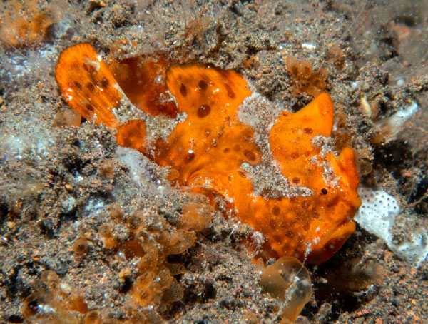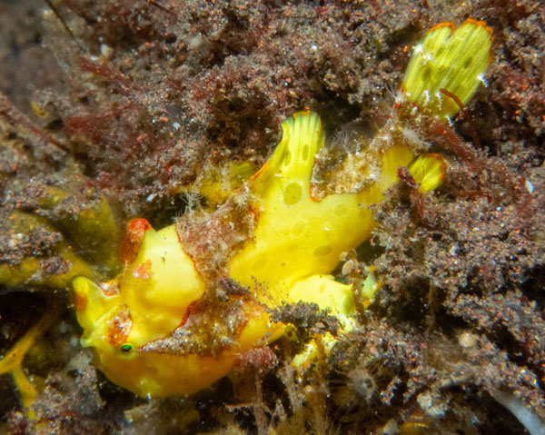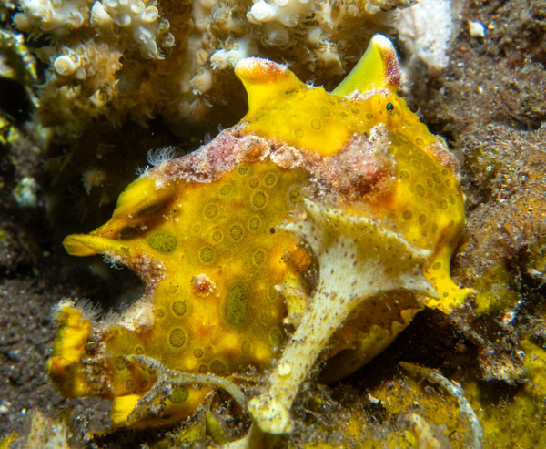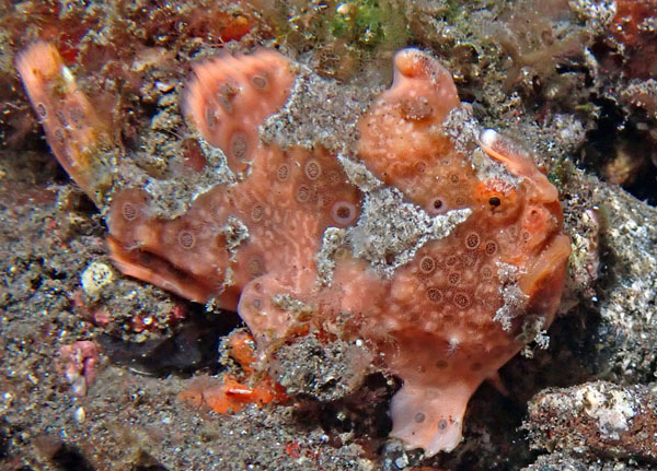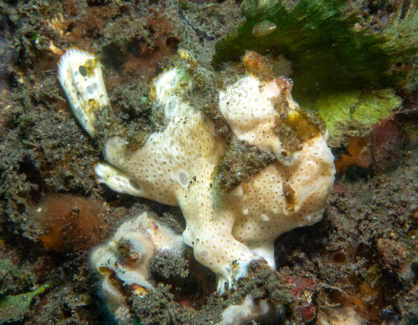 Adult Antennarius maculatus develop warts over the face and body. Young individuals are smooth and highly variable in color and can be difficult to distinguish from young Antennarius pictus and A. commerson. One character that seems unique to A. maculatus is, except for a few small black individuals, the presence of a patch of color that might sometimes resemble a crust of algae that starts at a narrow point right behind the eye and widens posteriorly, forming a roughly triangular patch usually ending just in front of and above the pectoral fin base. We saw these at many sites in the Tulamben and Amed areas.