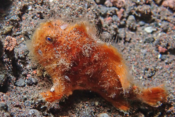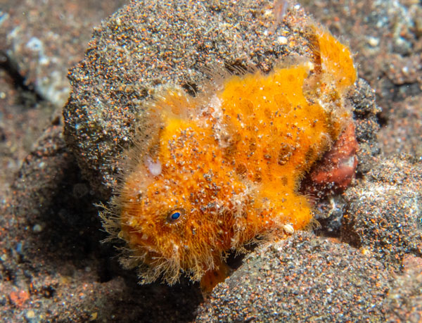 The first two photos below would certainly seem to be Antennarius striatus. The remaining photos are all somewhat questionable since the characteristic worm-like esca is not visibly in many of the small specimens. Possibly the esca develops more as the animal grows. All those we found in Bali were quite small to downright tiny, much smaller than specimens we have seen in the Philippines. All these figured fish were found in the area around Tulamben.