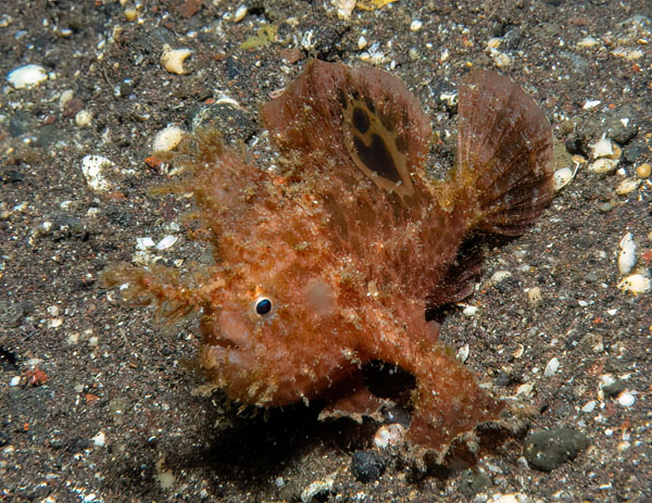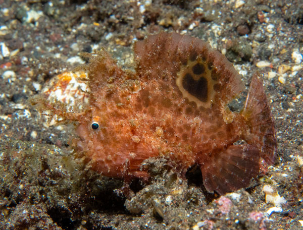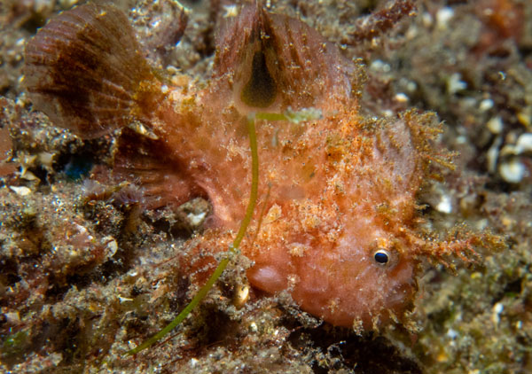 The common name "deep-water frogfish" is something of a misnomer as we have seen them commonly as shallow as 10m or so. Recently recognized and redescribed, these small frogfish are among the most common species we saw. They tend to live in muck sites, often around or under debris or algae on sandy slopes. Frequently we find two or three very different color forms together.