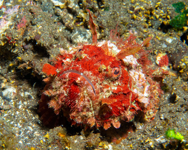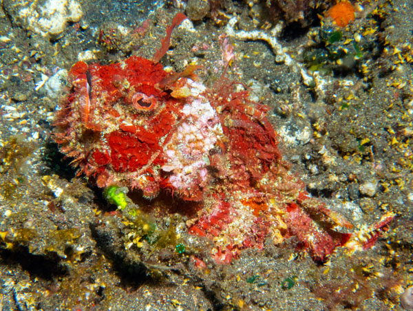 This one from Sidem resembles Scorpaenopsis obtusa in its short snout but has more fleshy papillae over the eyes and under the chin, so we are leaving the ID as tentative.