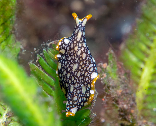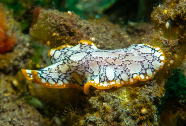 These appear to be specimens of the somewhat variable Pseudoceros scintillatus, although they also resemble what Newman & Cannon call Pseudoceros sp. 18 and the ID is controversial. Specimens we saw in the Philippines range from typical coloration to ones that look like these below. Those below were photographed at Pura Segara, Melasti and Seraya.