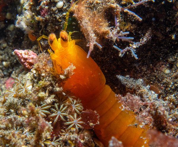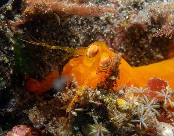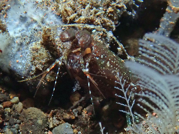 This variable small stomatopod was observed at a number of sites around Tulamben.