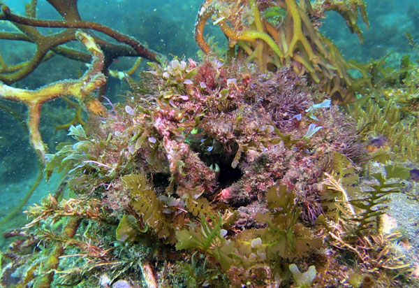 This decorator crab was spotted crawling on the sand but quickly climbed onto a kelp holdfast to better camouflage itself. Anacapa Island.