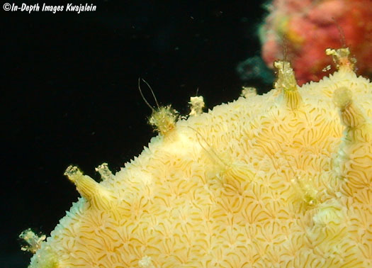 These worms with two feeding tentacles were embedded in a living colony of Pavona coral on a Kwajalein Atoll seaward reef.