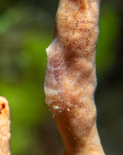 A pair of these small shrimp were well camouflaged on the same colored sponge at Tianyar.