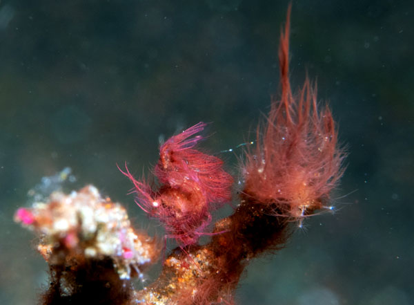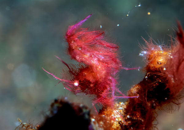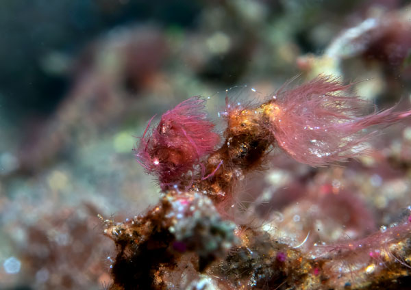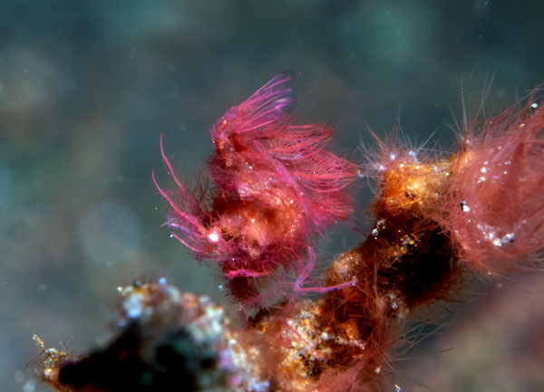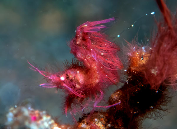 The ever popular hairy shrimp, a difficult creature to see. You have to look close for moving balls of fuzz. We saw these at several sites in the Tulamben and Blue Lagoon areas. They usually seem to be carrying eggs, but maybe the ones with eggs are just larger and easier to see.