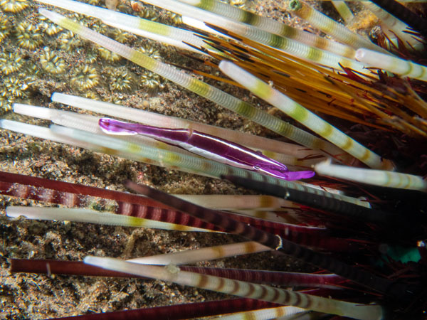 These elongate shrimp cling to the spines of long-spined sea urchins.