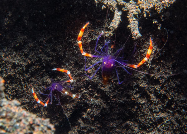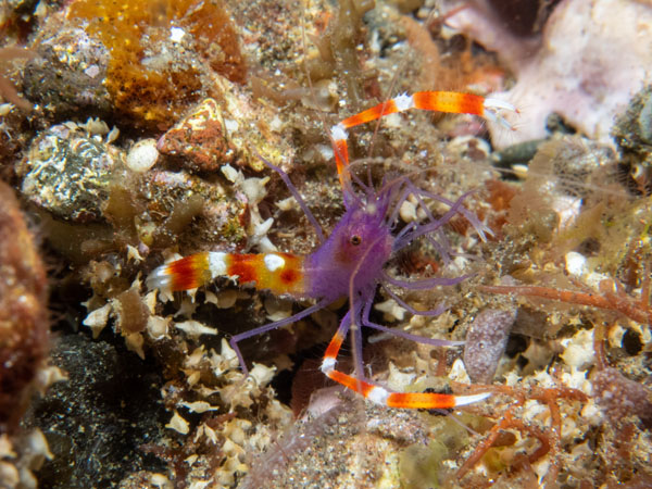 These purple bodied shrimp can be found on muck and rubble sites, often around the burrows of large mantis shrimp.