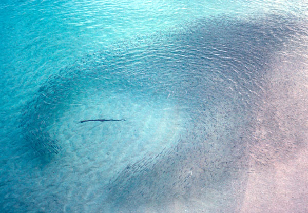 An elongate Fistularia commersonii scatters minnows in shallow water just off the beach. Photo taken from the pier at Green Island, Kure Atoll.