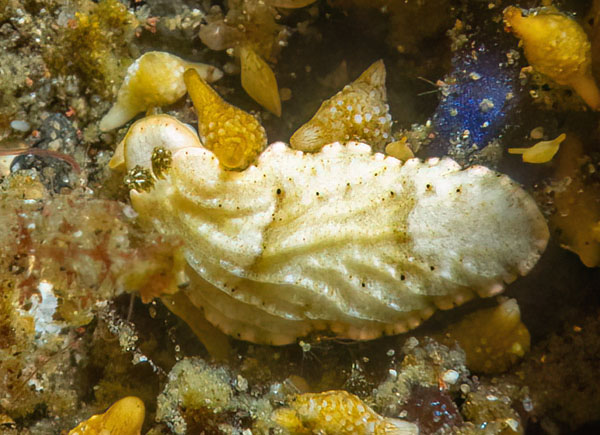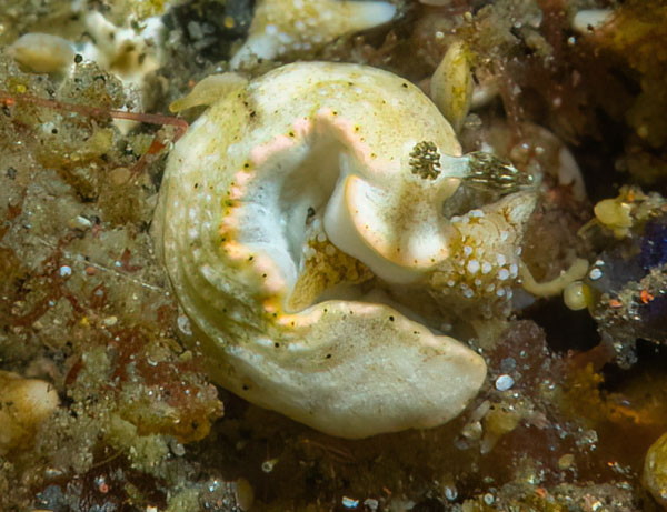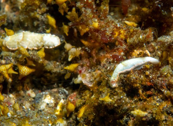 We have seen several of these at various sites around Tulamben. There are several species of small, whitish Dermatobranchus with longitudinal ridges, and I find them difficult to tell apart. The ID here is tentative.