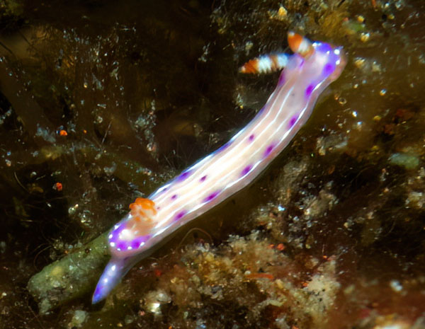 This one looks a lot like the one we are calling Hypselodoris sp. b287 but is much ligher in color and has two orange bands on the rhinophores instead of one. Still, it is likely it is a variation of the same species. It was at Sidem in November 2024.