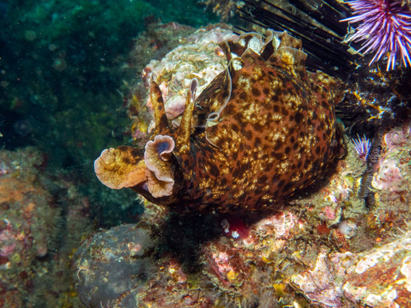 This is one of two species of Aplysia found in California, and is distinguished by its variable color and more ruffled parapodial flaps that are more open than the other species, Aplysia vaccaria, which is usually larger and black in color.