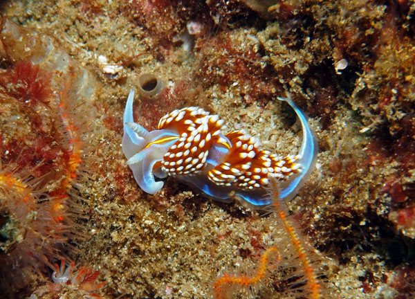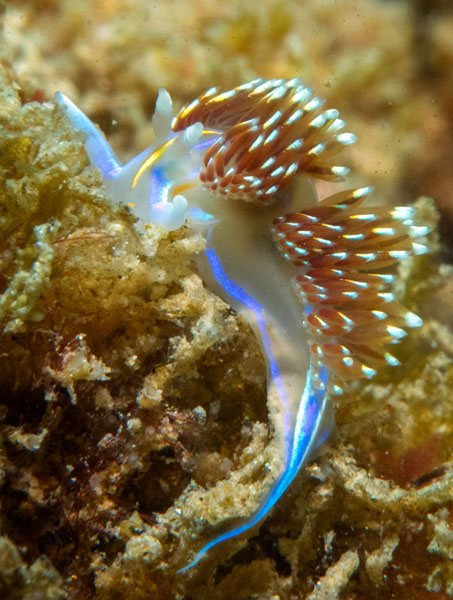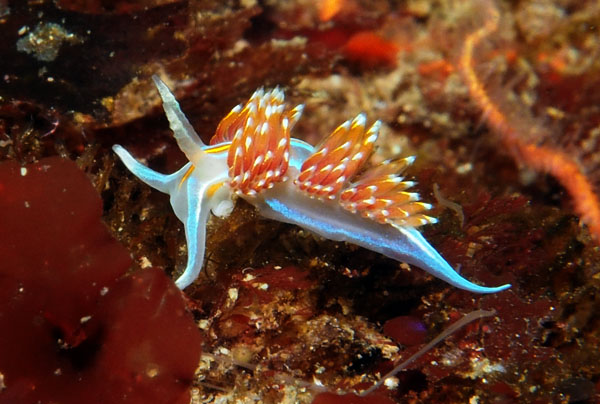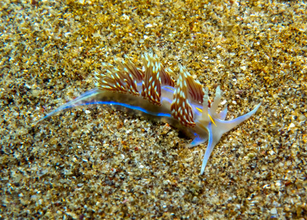 This highly photogenic animal was a very common species around the Channel Islands in the 1980s. It was formerly considered Hermissenda crassicornis, a separate species with a more northerly distribution.