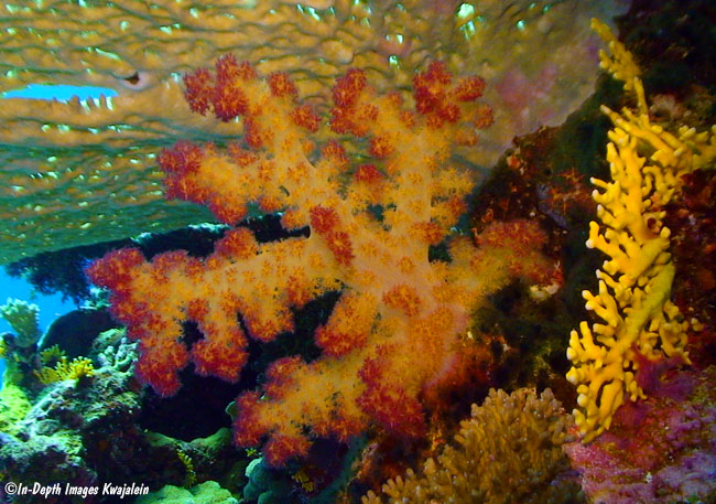 An interesting yellow Dendronephthya with red tips under a table Acropora coral with some yellow Distichopora on the top of a small, steep-sided pinnacle exposed to swift currents from a nearby deep water pass.