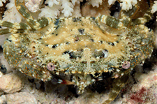 The rear pair of legs of dromiid crabs is situated so that they can be used to hold something over the crab's shell, often a sponge but sometimes tunicates, clumps of soft coral, algae or any other item that may help to shield the crab from predators. Because there are numerous species in the family and critical taxonomic details of the crab are difficult or impossible to observe without a specimen in hand, most of our identifications are tentative and should not be taken as positive IDs.